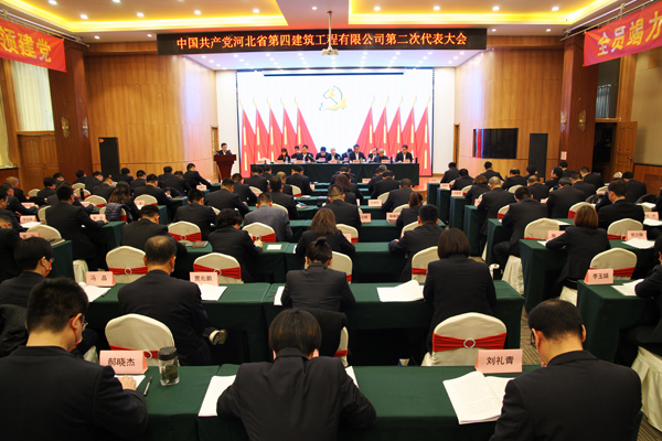 当日,中国共产党河北省第四建筑工程有限公司第二次代表大会在石家庄市利淳商务酒店胜利召开。在预备会之后,大会在庄严的《国歌》声中隆重开幕,96名党员代表齐聚一堂,凝聚思想共识,共商党建良策,共谋发展大计,共绘美好蓝图。集团公司党委书记、董事长、总经理张天平莅临会议并讲话,集团公司党委办公室主任、组织部部长张秋英、集团公司纪委副书记、纪委办公室主任、监督检查室主任张煜出席大会并全程指导。会议先后由公司党委副书记、总经理唐志强,党委副书记、纪委书记、工会主席李怀生主持。